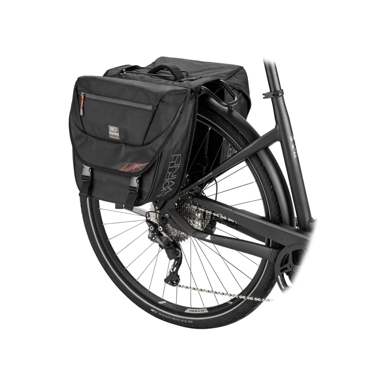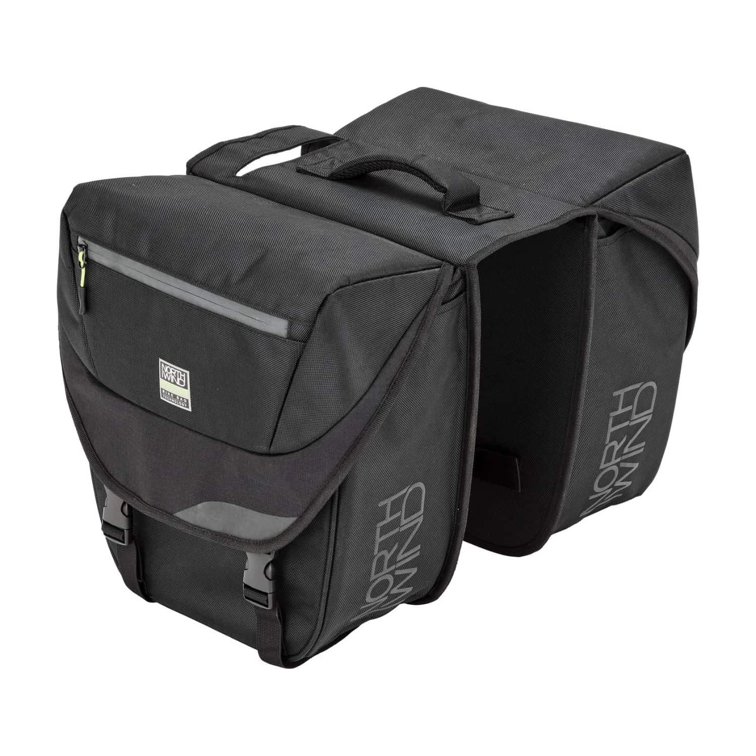 Mit einem Gesamtvolumen von 32 Litern bietet die Pannier Classic von Northwind viel Platz und eignet sich deshalb sowohl für alltägliche Fahrten als auch für Fahrradtouren. Befestigt werden kann sie an fast jedem Gepäckträger, der mit einer Federklappe ausgestattet ist. Dazu wird einfach die Klappe geöffnet, die Doppeltasche auf den Träger gelegt und die Federklappe wieder geschlossen. Anschließend wird sie zusätzlich mit einem Klettverschluss fixiert. Um diesen Vorgang zu erleichtern und um das Tragen der Tasche abseits des Fahrrads zu ermöglichen, wurde ein Softtragegriff angebracht.